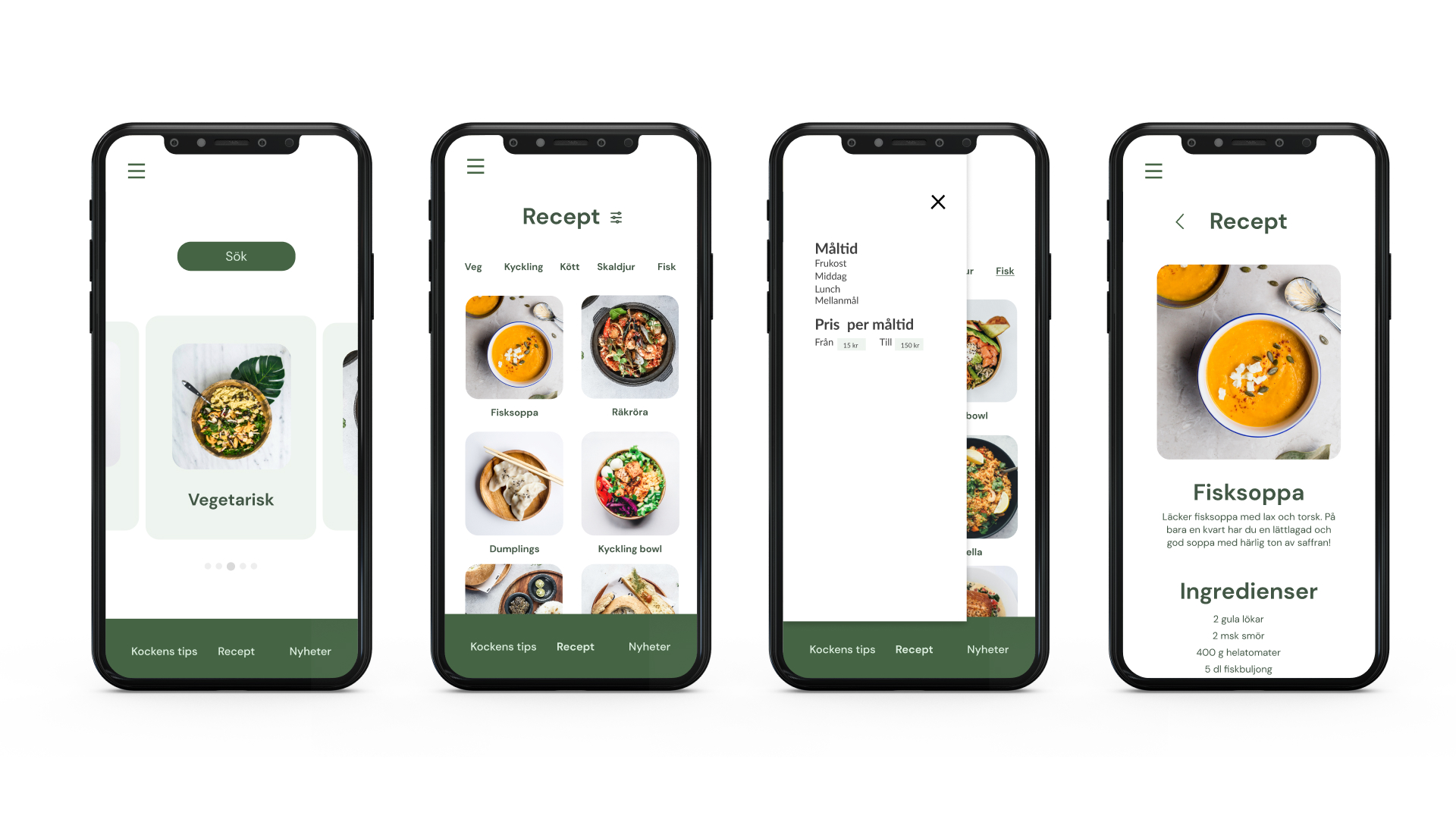 The design follows a Scandinavian-inspired aesthetic, characterized by its clean, minimalist lines and user-friendly interface. The calming green color palette not only enhances the visual appeal but also evokes a sense of health and well-being, reinforcing the app’s focus on nutritious eating.